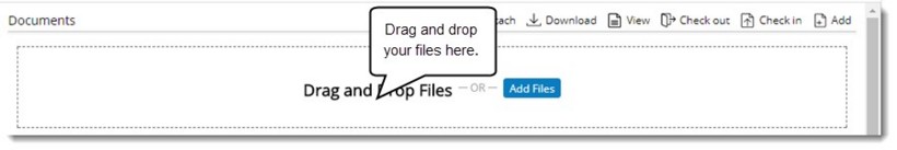 Documents can be dragged to the drag/drop area and added to the Project. When a document is dragged to this area Add Document window is displayed. Enter values for fields displayed in the add document window and add document to the project.