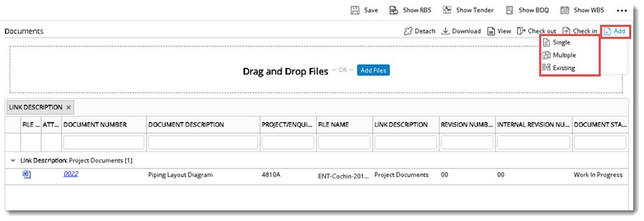 In a project usually bulk volumes of documents of various contexts, ranging from contract to legal are usually handled. Manually managing these documents is a complicated process. The document tab serves as an automated mechanism for maintaining all such documents connected to the initial stages of the project. Documents that are created during project execution are maintained in the WBS.