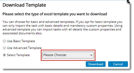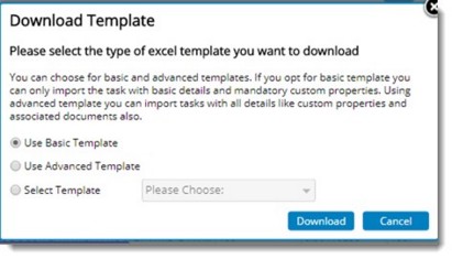 The Basic option includes only the mandatory fields required to import tasks to WBS. When you select this option the WBS reference name is used as the default file name for the template that is downloaded. You can change this file name and enter a new file name while saving the template.