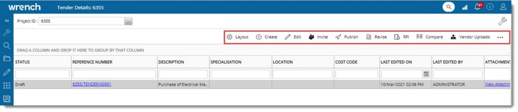 On selecting a Project ID, if tenders are created for the Project, it is displayed. Or else a blank window is displayed. In the grid different tender details like Status, Reference Number, Description is displayed here. In the tool bar options to carry out different tender related operations is available.