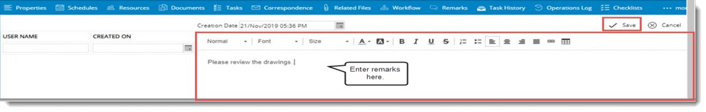 - A text editor is enabled in right pane. Enter the remarks here.