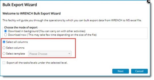 - If the option Select all Columns is selected, click the Next button to continue. An MS Excel template is generated. All the task columns will be exported.