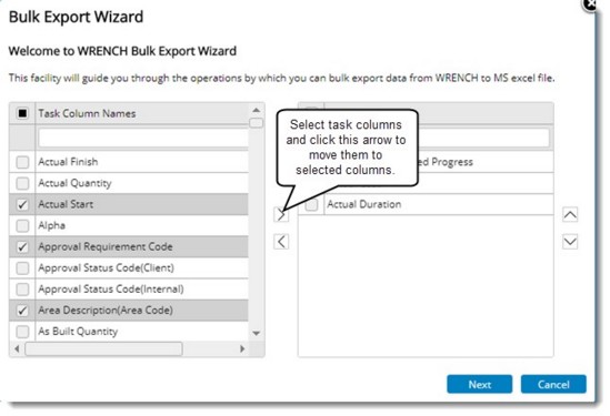 - If the option Select columns is selected, on clicking the Next button, task columns selection window is displayed.