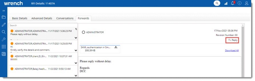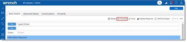 NOTE: Option to forward RFI will be available in RFi’s which are in Open and Re-Open status.