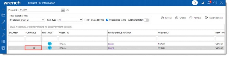 The forwarded RFI’s are listed in RFI Details window. RFI’s that are forwarded is indicated by forward icon in the column FORWARDS.