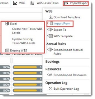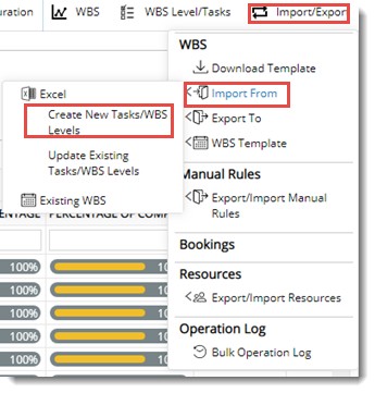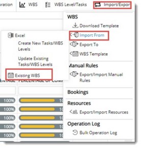 - In the WBS options bar click Import/Export>>Import From>>Create New Tasks/WBS Levels