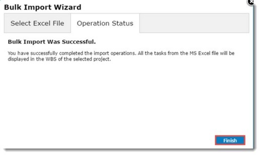 Task details entered in an MS Excel template is imported to WBS as new tasks. Ensure that MS Excel template is created and values are entered in the template prior to starting this operation. For more information on generating import template refer section WBS Template.