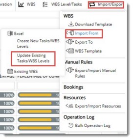- In the WBS options bar click Import/Export>>Import From>>Update Existing Tasks.