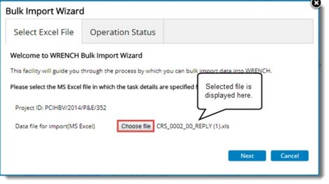 It is a common practice in many scenarios to prepare the task list outside the system (such as in MS Excel. MS Project, Primavera etc.) Wrench uses MS Excel as a common medium through which task can be imported. Data from the planning system is exported to MS Excel, from where it is imported to Wrench. The two import options available are: