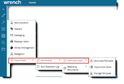 For importing, first a import template is generated, document properties are entered in the template file and the details are imported to system.