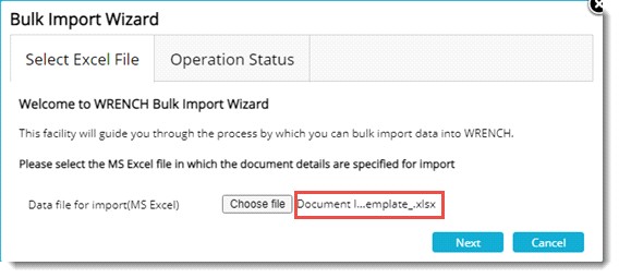 - Click Choose File to select the excel file in which document details are specified for Import.