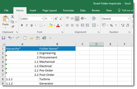 - In the column Hierarchy enter the order in which the folders should be created. For Example: If you want to create a main folder Engineering, in the Hierarchy column enter 1 and in the Folder Name enter Engineering.
