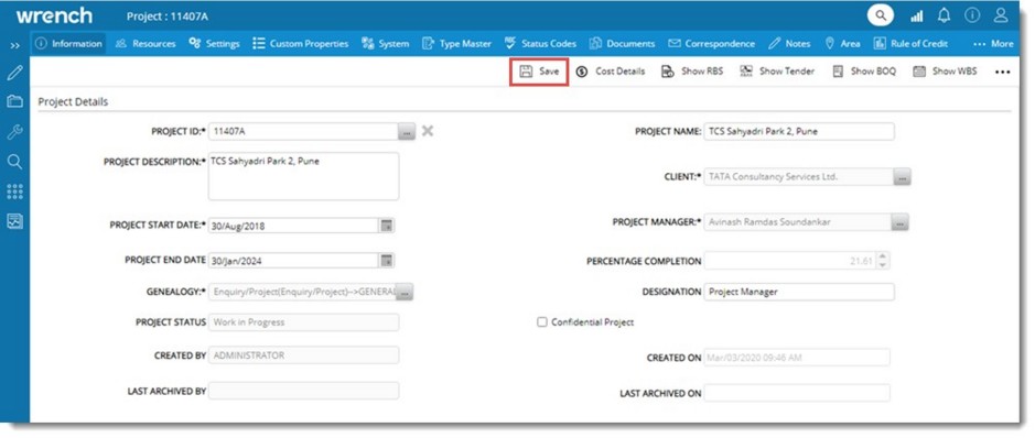 Once a project is created. Project Properties are displayed here. You can edit project properties from this window. After editing the properties click Save to update changes. If the Project is archived, the following details are displayed.