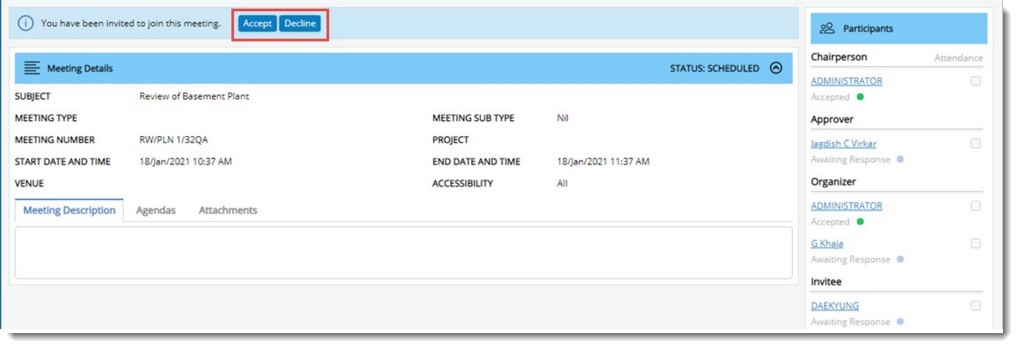 - A meeting can be either accepted or declined. Click the corresponding button to accept or decline a button.