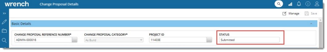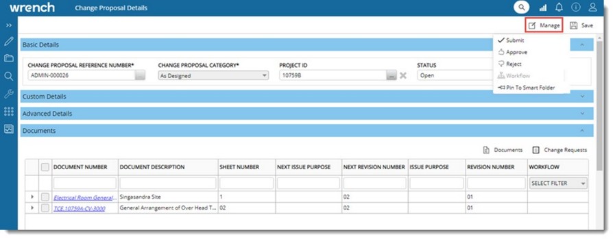 After creating and saving a change proposal, the option Manage will be enabled in the Change Proposal Details window. Different operations like submitting, approving, and rejecting the Change Proposal can be carried out from the Manage Menu.