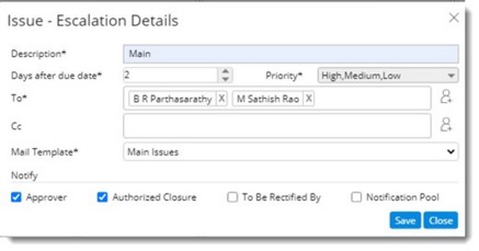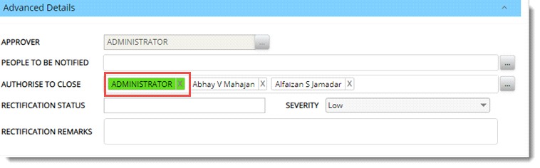 When the Issue is marked for closure, it gets closed only when authorized personnel accepts it. User may specify multiple users here separated by comma, any one of whom may close snags in this group.