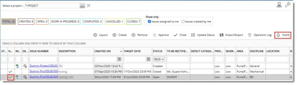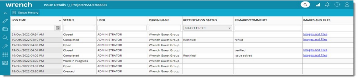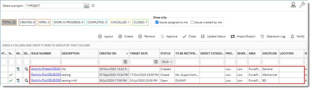 Issues and count of Issues with different statuses like Created, Open, Closed, Work In Progress, Completed and Cancelled will be displayed in different tabs. On clicking a tab, the respective Issues List will be displayed. For Example: If the tab OPEN is clicked, list of Issues with status Open will be displayed.