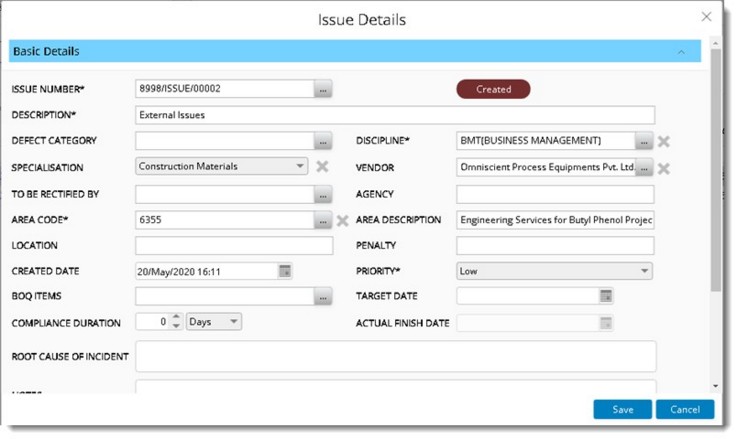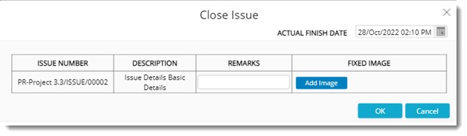 Enter the finish date of the issue as specified by user. This field is disabled when creating an Issue. Date is captured automatically when the status is changed to ‘Closed’. The date can be changed in edit mode while closing the Issue. Actual Finish Date can be edited while carrying out Update Status operation, when new status is changed to closed.