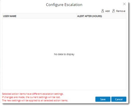 An alert message as displayed in the preceding figure will be displayed and no escalation details will be displayed. Any new settings made will be save against selected action items and any existing settings will be lost.