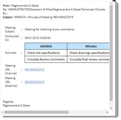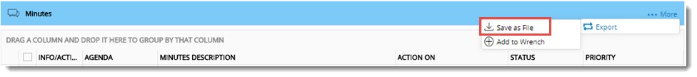 Minute details can be exported to a minutes template available in the system. If the meeting is in closed or follow up status, minutes details can be saved to a pre-defined template and the template file can be added to WRENCH.