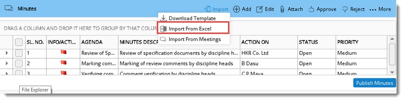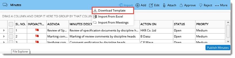Minutes can be imported in bulk using an MS Excel import template. An Import template is generated, values for different columns are entered in template and the details entered are imported to the meeting.