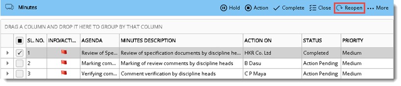 If the Organiser or Chairperson of a meeting feels the work is not completed, they can re-open items marked as completed.
