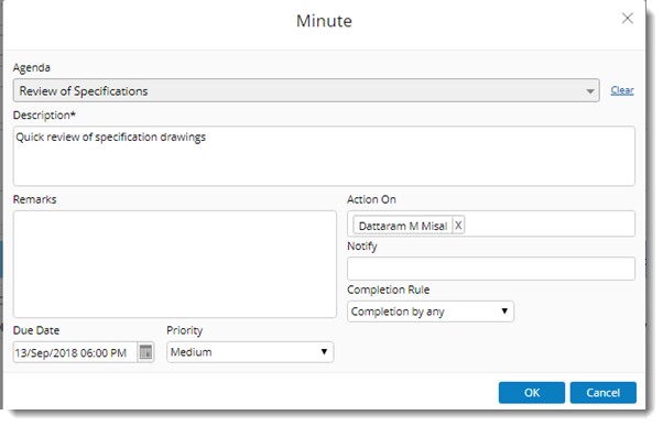 - Action items defined for the meeting is displayed. Select the check box next to the action item. Click OK.
