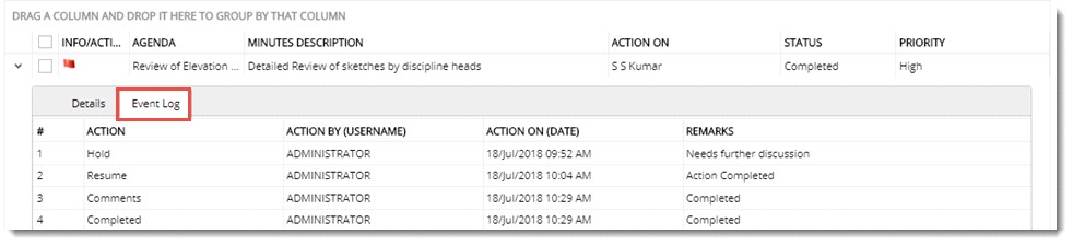 Entire details of the action carried out on the Action Item is displayed here. Items in the log can be grouped by column header.