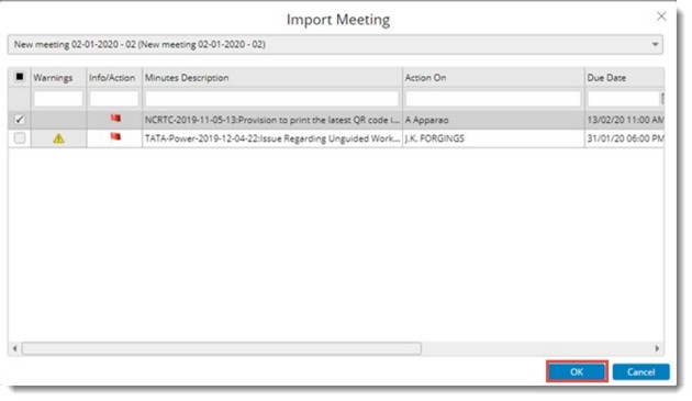 NOTE: While importing, if the due date is less than the meeting start date a warning message is displayed and import is not possible. But the date can be changed, and the import operation can be continued. In addition, while importing if Action On user is disabled from the system, a warning message is displayed, and import is not possible. The action on user can be changed and the import operation can be continued. A pending action item once imported to another meeting cannot be imported, if the meeting to which it is imported is not completed. In such cases a warning message is displayed.