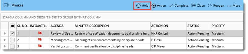 Sometimes the recipients of an action item (actionee) may need extra time to complete the action assigned to them. They will be holding the action item for a specific time. They might also require to update the intermediate action taken for a minute.