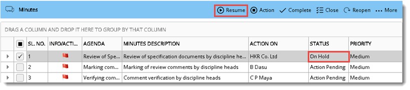 When the action item on hold is selected, in the tool bar label of the Hold button changes to Resume. Resume button is displayed only if all the action items are on hold.