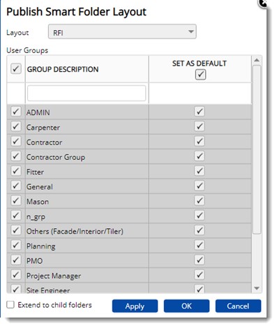 NOTE: If the checkbox under the label SET AS DEFAULT is selected, Set as Default check box next to the selected user groups will be selected. There is no need to select the option separately for each group.