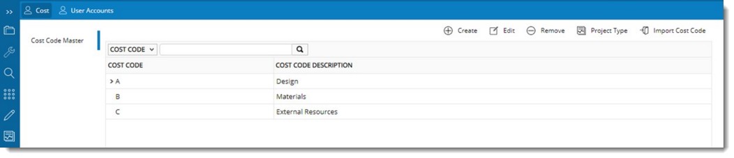 Masters window is displayed. Masters configuration window for different items are arranged under tabs. The tab Cost is selected by default.