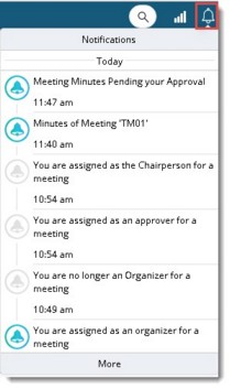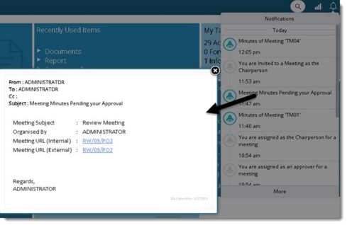 Correspondence notifications, Workflow operation notifications and general notifications are indicated using different icons. Last ten notifications are displayed at a time in the pane. Notifications received on the same day and previous day are displayed separately in the pane. On clicking a notification, details of the notification are displayed in a separate window.