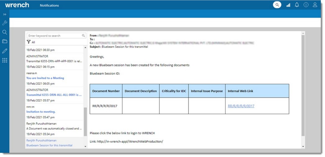For Example: Suppose a user creates a mail in WRENCH from correspondence module or during transmittal release. Due to some technical reason like incorrect SMTP credentials in WRENCH Server, the external mail may not to be sent. In such cases, a notification is sent to a user alerting this. This notification will be available in the notification pane.