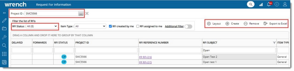 Options to create an RFI, remove an RFI and export RFI details to MS Excel is available in the tool bar.