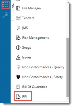 Select a Project. On selecting a Project, RFI’s created under the projects is listed in the grid.