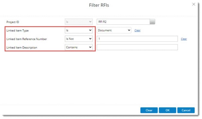 Here Linked Item Type, Linked Item Reference Number and Linked Item Description are available as the filter criteria. Project ID can be changed by clicking the browse button.