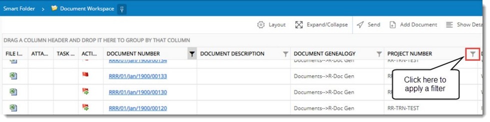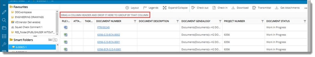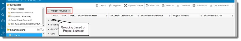 Content in the smart folder can be grouped based on the column header. Grouping can be done for document, task and correspondence smart folders.