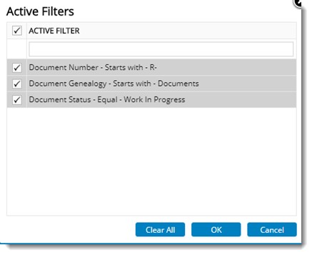 Once content in smart folder are filtered, data is displayed in the grid as required. When the user starts working on the documents at some point of time there are chances the user searches a document and will be unable to find it. User may not be sure about the multiple filters applied in the smart folder. User has to move through multiple column headers and check the filters. This is confusing and time consuming. To handle such situation option to view and clear the applied filters is available.