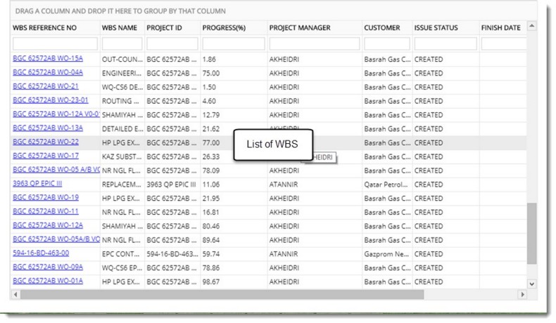 By default recently created WBS will be listed first. The list can be sorted by clicking the column header. Also there is a facility to search within the list. By typing the required search value in the first row of any of the columns, the list will be filtered based on the value.