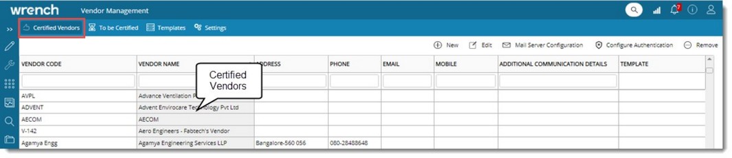 In the window tab Certified Vendors is selected by default. Certified Vendors for the project is displayed in the window. Options to create, edit and remove vendors will be available in the window.