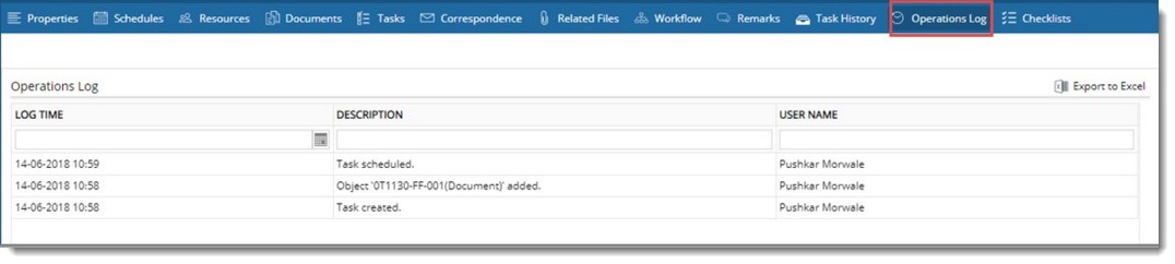 A log of entire operations carried out on a task is displayed here. This helps in tracking different operations carried out on a task and the user who carried out this task. Any undesirable operations can be tracked using this log. Operations carried out on documents attached to a task are not listed here.