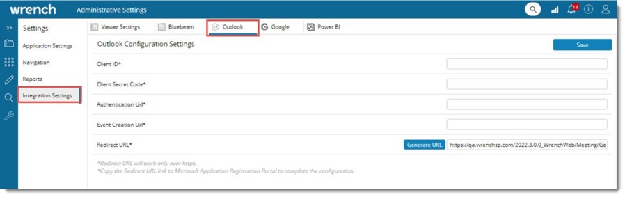 Organizations which use MS Outlook, schedule events in Outlook calendar. Some organizations require WRENCH meeting schedules to be synchronized in Outlook Calendar as well, and receive alerts and notifications. To make this possible, an integration gateway is configured here.