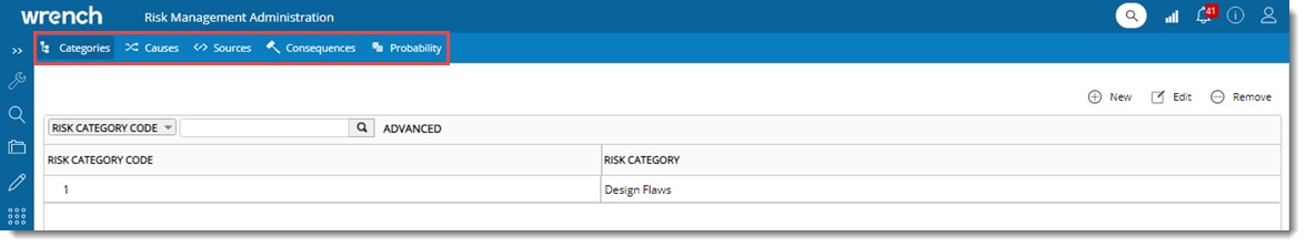 New Risk Cause is displayed in the grid. You can edit the created risk cause and remove a risk cause provided it is not used in any Projects.