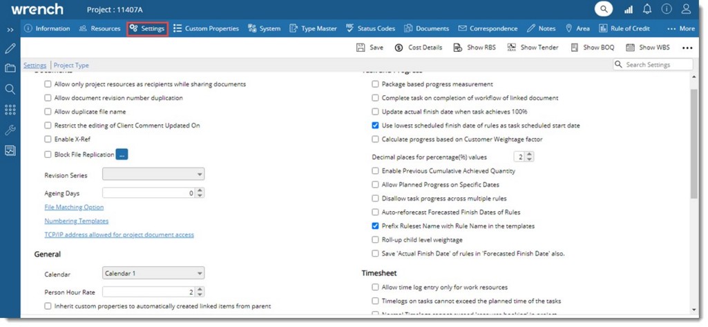 Here basic document and Work Breakdown Structure settings can be defined. The settings that can be defined in this pane are described in the following section.