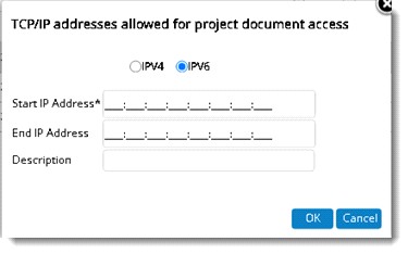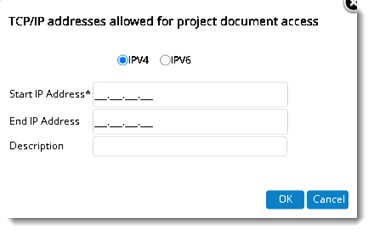 In confidential projects which need high security, project documents are to be made accessible only from specified network segments based on TCP/IP address. Hence, a facility to assign each high security projects with a TCP/IP segment, ensuring only users working from this specified network segments will access files of the project is required. Click the hyperlink TCP/IP allowed for project document access, to configure TCP/IP address. For more information refer Restricting project access for internal domain users. |