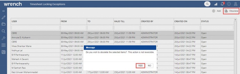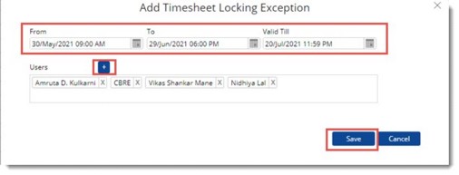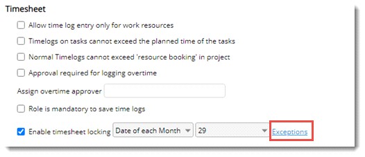 Locking interval can be selected from a drop-down list. Options available are Day of each Week and Day of each Month. If the option Day of each Week is selected, Friday is displayed by default as interval. Days of the week are available in the drop-down list. If the option Day of each Month is selected, End of the Month is displayed by default as interval. Dates of the month are available for selection in the drop-down list. If this setting is enabled, user will not be able to submit time logs if any of the selected time log date is before the locking date of the project. Submission of full-Time logs for the week is restricted with a warning message. Defining exceptions in Project Timesheet Locking Though the time sheet is locked on Day of each Week or Day of each Month basis, in some cases this lock must be lifted for some users. To handle this in the Project Setting window, option to define exceptions is available. If an exception created is no longer valid or applicable, user may obsolete the created exceptions. |