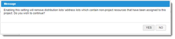 On clicking YES, setting is enabled and distribution lists, address lists which contain non-project resources that have been assigned to the project is removed. Only project resources will have access to shared documents. |