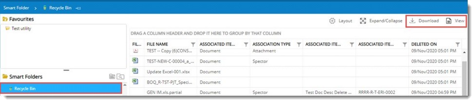 Download: Select a file and click Download to download a copy of the deleted file. The selected file will be downloaded. Multiple files are downloaded as Zip file.